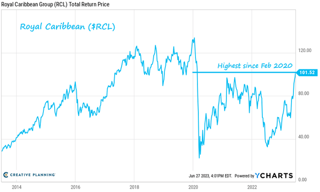 Bu yıl S&P 500'de en iyi performans gösteren üçüncü hisse senedi Royal Caribbean. 105 daha güçlü ve 27 Haziran Salı günü, hisse senedi 21 Şubat 2020'den bu yana en yüksek kapanışını yaptı. Yolcu gemisi endüstrisi, Covid-19 salgınının ardından ulaştığı düşük seviyelerden daha yükseğe sıçradı. Bu yılın ilk çeyreği için şirket, bir önceki yıl sadece %57,4 olan doluluk oranının %102,1 olduğunu bildirdi (kapasiteden daha fazla kamara alıcısı var).